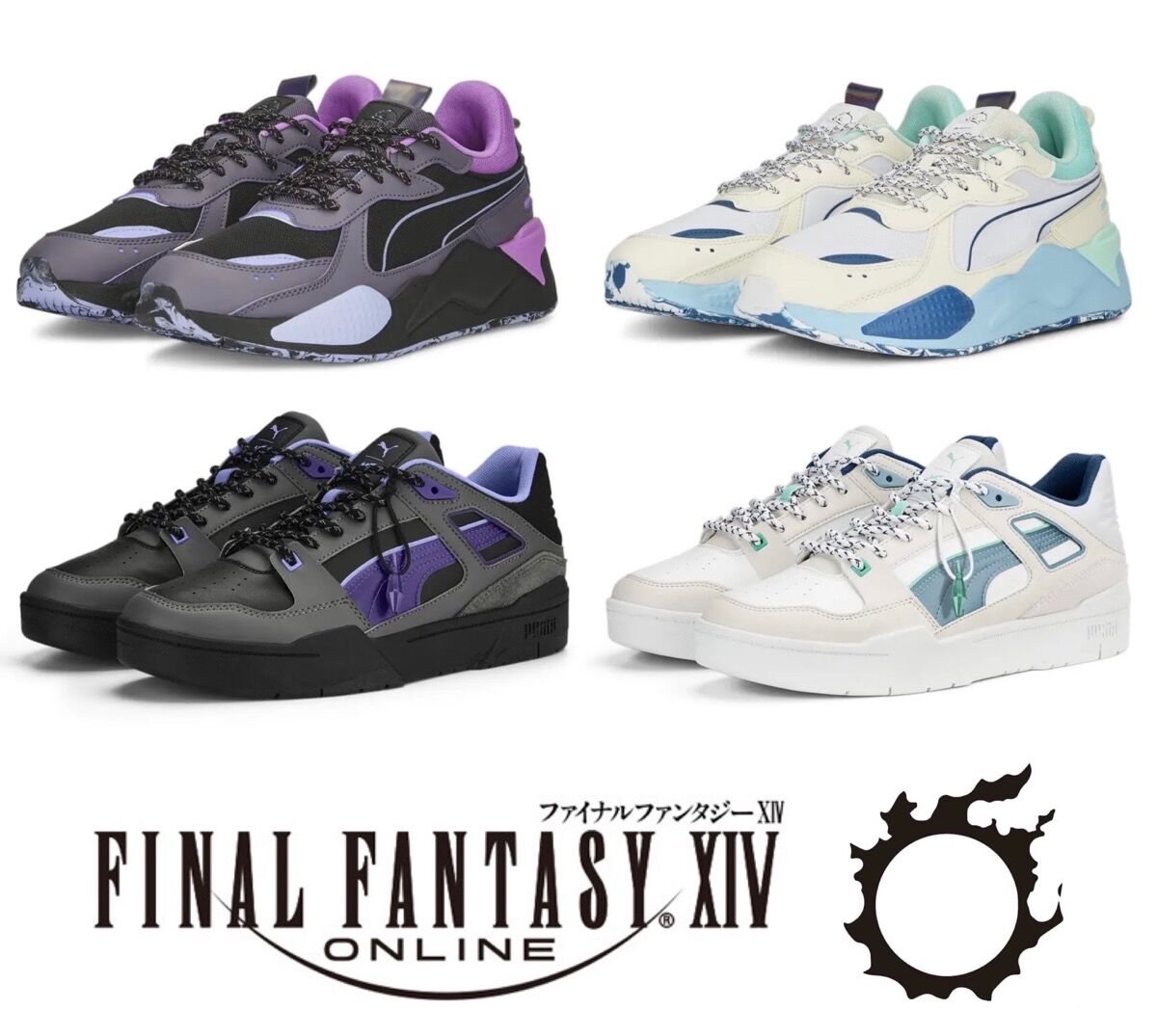 本商品はプーマの名作「RS-X」と「SLIPSTREAM」をベースに、『FF14』の世界を表現。グリーンやブルーで爽やかに彩ったホワイトベースと、妖艶なパープルを効かせたブラックベースは、『FF14』の中で対極として描かれる"光"と"闇"の世界を表しています。